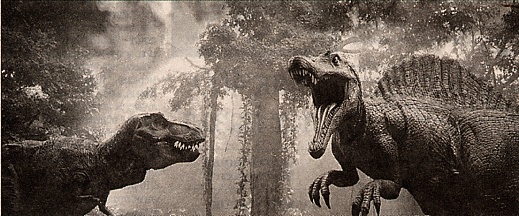 Это, разумеется, не исключает наличия абсолютной опасности, неподконтрольного разуму зла -иначе доисторический дисней-ленд попросту не работает. Джон-стон, надо отдать ему должное, модифицировал образ врага. В предыдущих сериях это был знаменитый Т. Кех, на сей раз консультанты предложили спинозав-ра - самого массивного из хищных ящеров. Подчеркивая усиление угрозы, авторы идеи презрительно называют тиранозавра шакалом. Новые твари, спору нет, крупнее и кровожаднее, но за сданного в утиль ящера все-таки обидно: что ни говори, а тиранозавр был забавен.